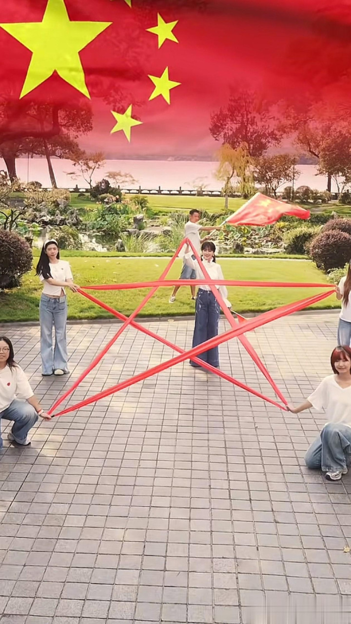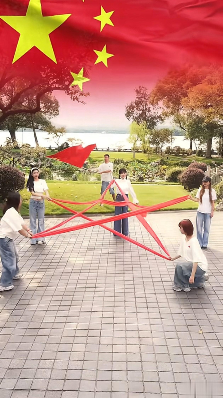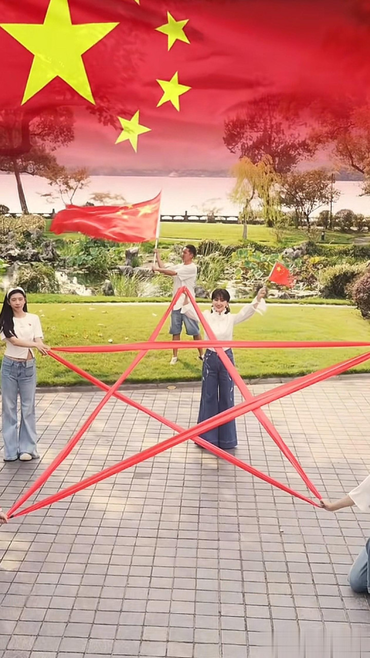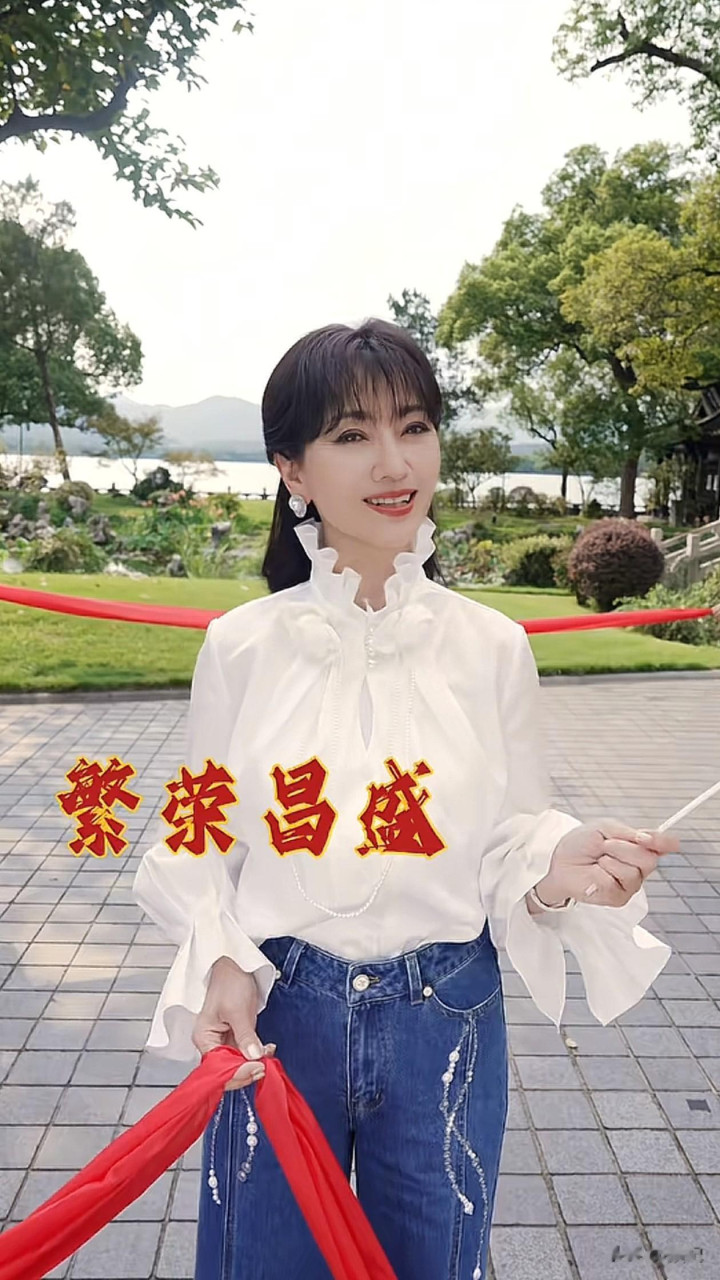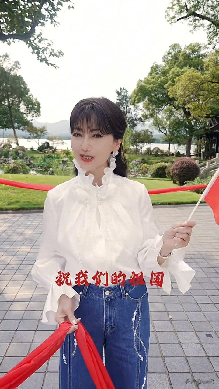 71岁赵雅芝国庆穿搭: 白衬衫+牛仔裤, 减龄高级, 手拿国旗像41岁