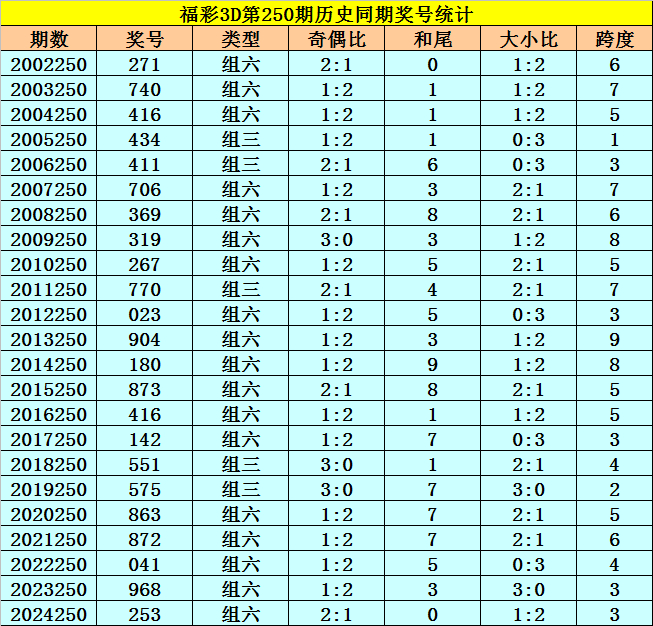 福彩3D历年第250期同期奖号为:271 740 416 434 411 706 369 319 267 770 023 904 180 873 416 142 551 575 863 872 041 968 253。