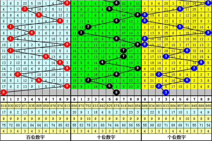 百位号码:第25245期-25249期奖号为:8-9-2-5-9,振幅为7点,分布较分散,本期看好百位走低,注意号码0。