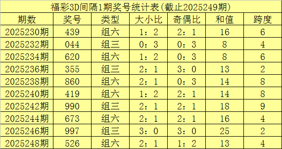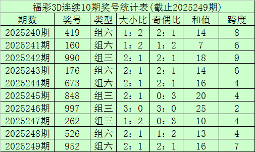 开奖回顾:福利彩票3D第25249期奖号开出952。奖号类型为组六,奇偶形态为奇奇偶,大小形态为大大小。