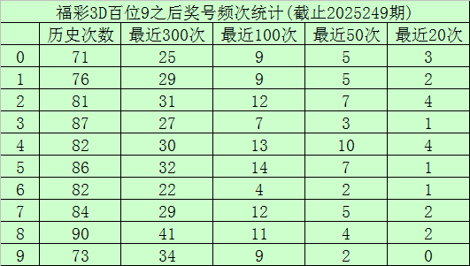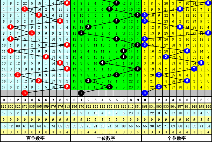 百位杀号:上期百位开出号码9,历史上百位号码9已开出813次了,最近100次百位号码9出现之后,其下期各号码频次分别为:号码5出现14次,4出现13次,2、7出现12次,8出现11次,0、1、9出现9次,3出现7次,6出现4次。