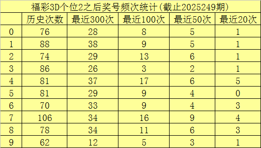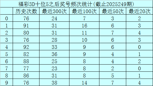 个位杀号:上期个位奖号为2,历史上个位奖号2共开出803次,最近100次个位奖号2出现时,其下期号码0-9开出次数分别为:奖号4开出17次,7开出16次,2开出13次,8开出11次,1、5、6开出9次,0开出8次,9开出5次,3开出3次。