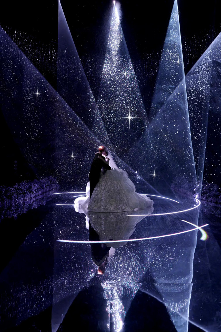 室内的场景更是梦幻。这大舞台堪比演唱会现场了吧!不论是从灯光设计还是地面环境,都可以用完美来形容,如果不是新郎新娘在画面里,真的没有人会想到这是婚礼现场吧。