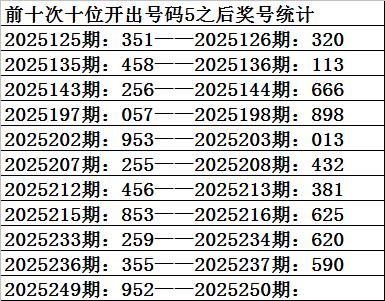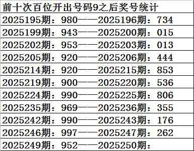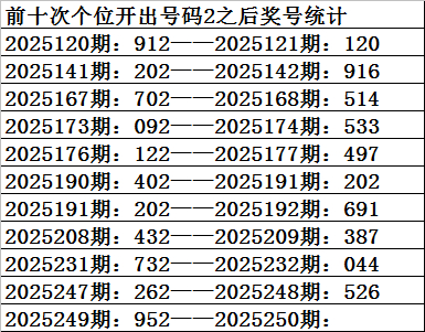 一、上期开奖:福利彩票3D第2025249期奖号为952。奇偶比为2:1,大小比为:2:1,奖号和值为16,奖号跨度为7。