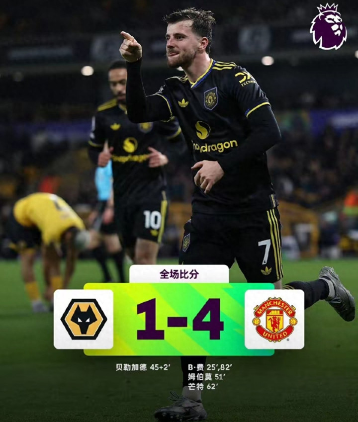 比赛尾声阶段,狼队防守出现失误,莫斯克拉手球被判点球,B费主罚一蹴而就,完成个人本场双响,最终将比分定格在4-1。此役过后,曼联排名升至英超第六,而狼队则以2平13负的惨淡战绩继续稳居联赛垫底,与安全区的分差拉大到13分,保级形势岌岌可危。